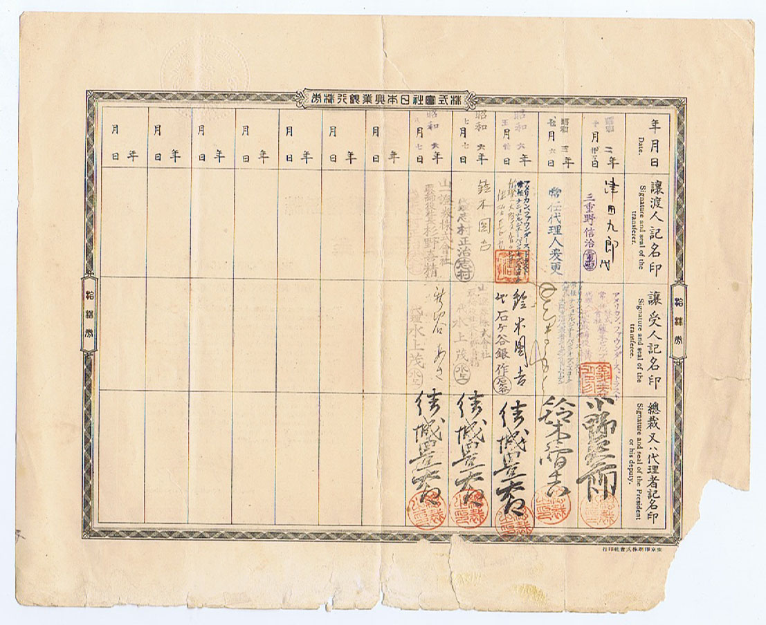 10 SHARES CERTIFICATE 50 YEN EACH SHARE of NIPPON KOGYO GINKO (THE INDUSTRIAL BANK of JAPAN).