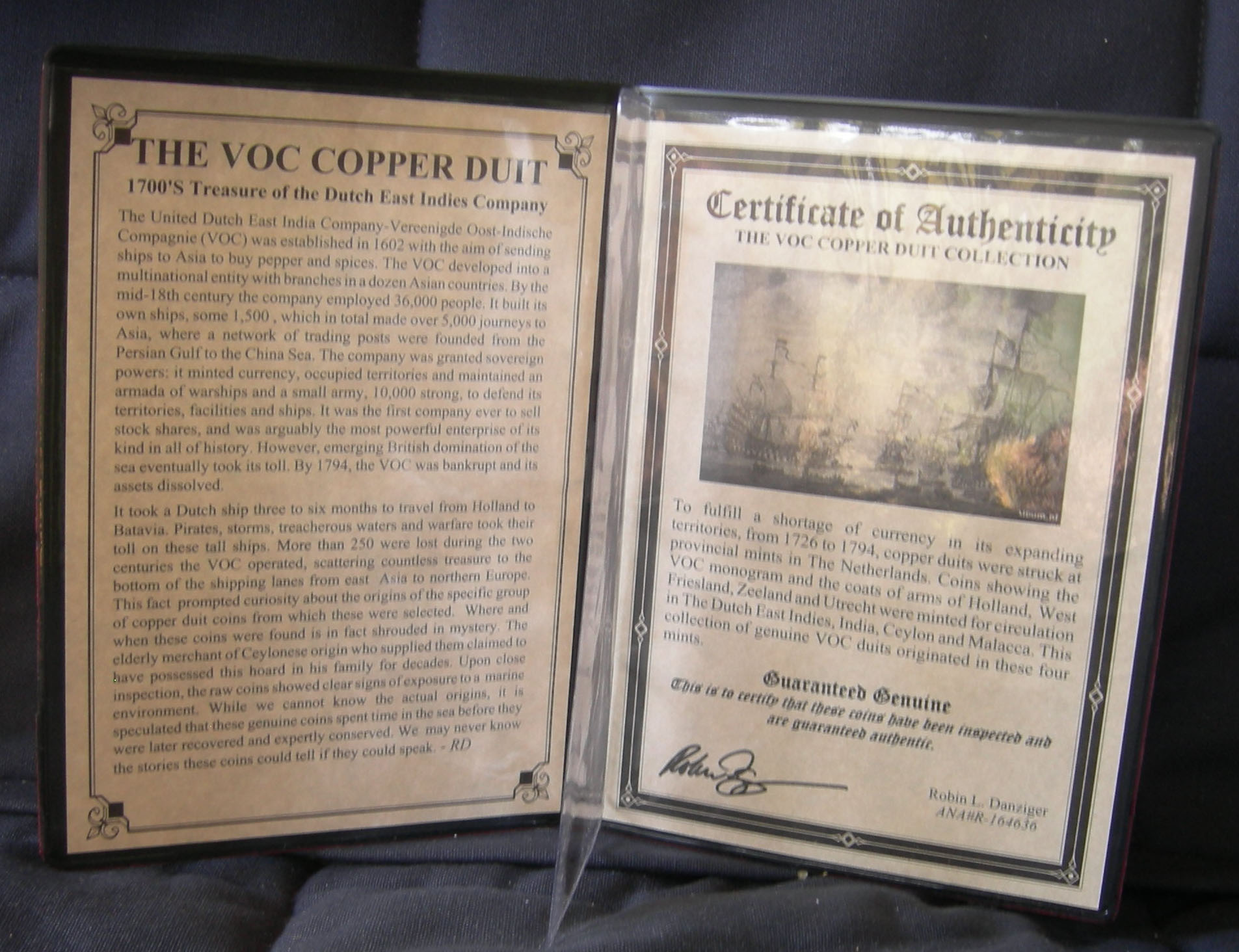 These 4 different coins dated from about 1750 to the decline of the company in 1794 and represent the following Dutch locations; Holland, West Friesland, Utrecht & Zeeland. The folio contains information on the Duit.
