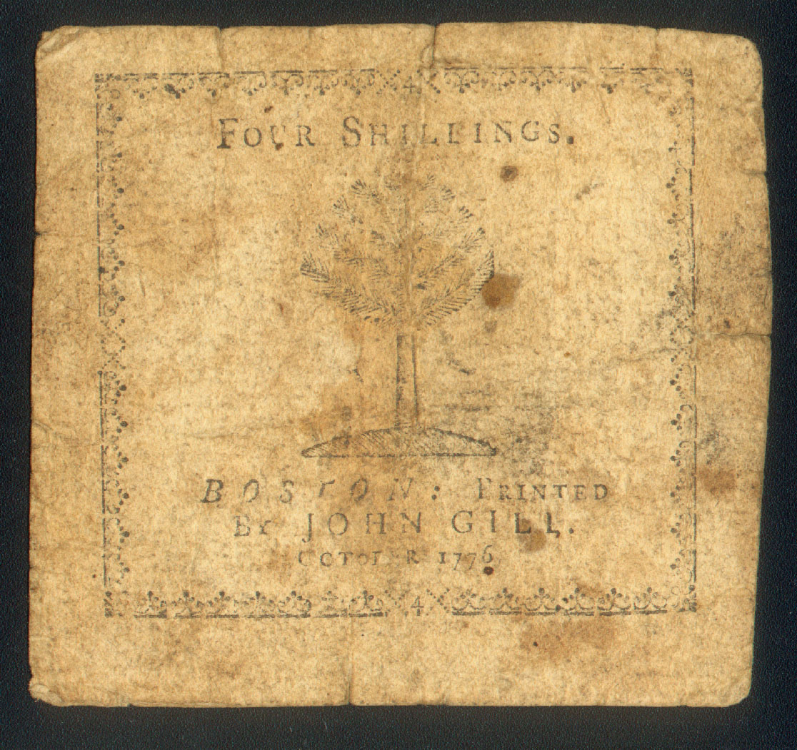 1776 MASSACHUSETTS PAUL REVERE CODFISH 4 SHILLINGS SIGNED by MINUTEMAN J. HASTINGS