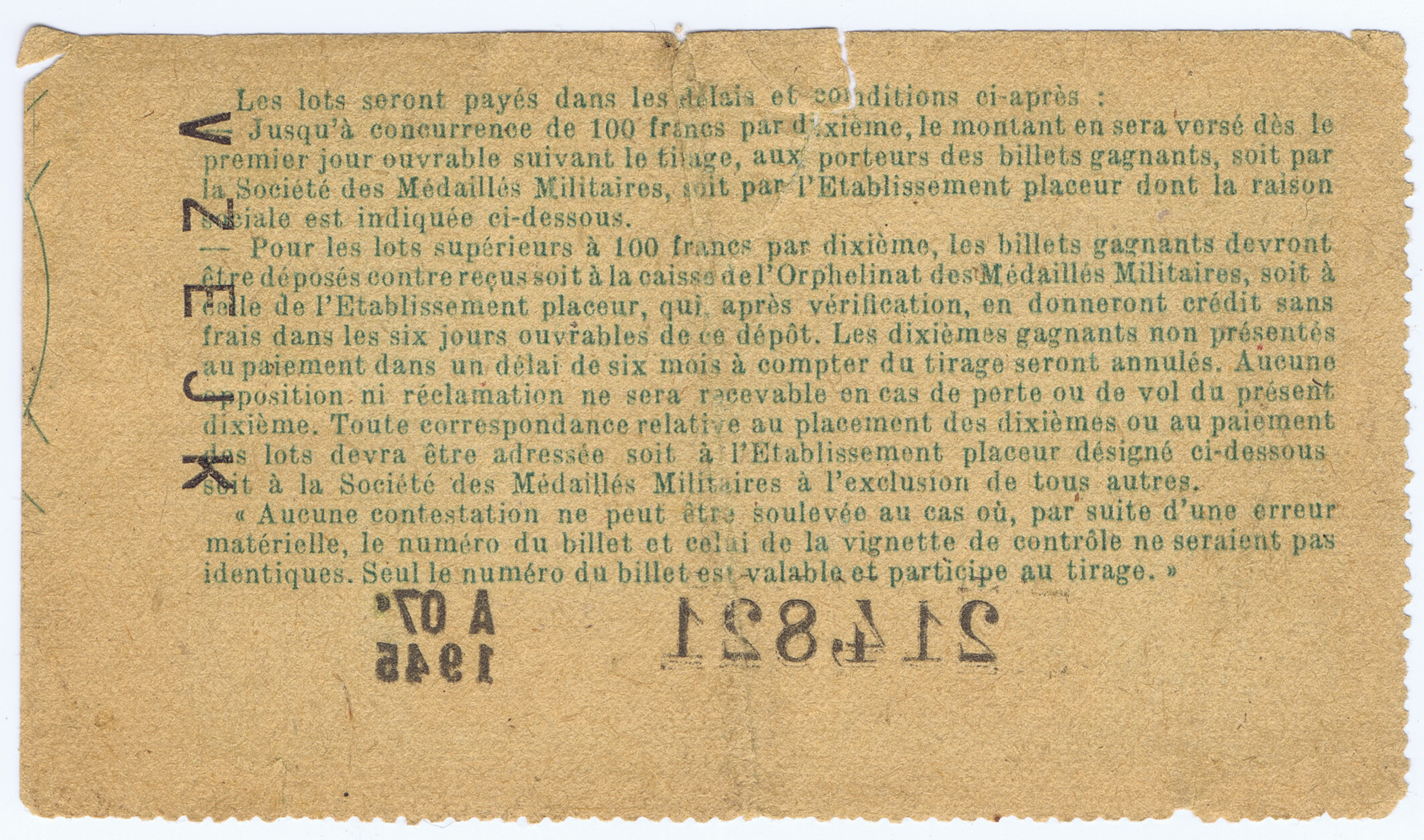 1945 FRENCH NATIONAL LOTTERY TICKET for a 1/10th SHARE in the (MEDAILLES MILITAIRES) MILITARY MEDALS – SERIES A with STAMP