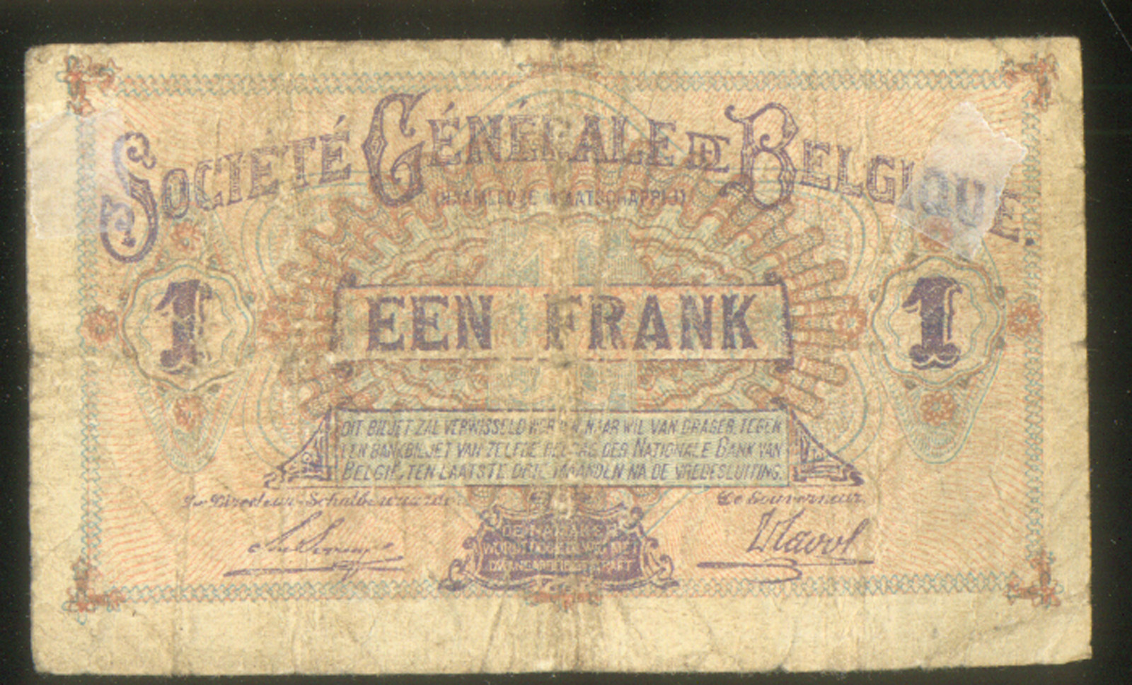 Belgium 1 ( One ) Franc of 1915 German Occupation ( World War I ) – Standard Catalog of World Paper Money ( Formerly Pick ) # 86a First Type Circulated with 3 Pinholes & Folds – Bilingual ( French & Flemish )