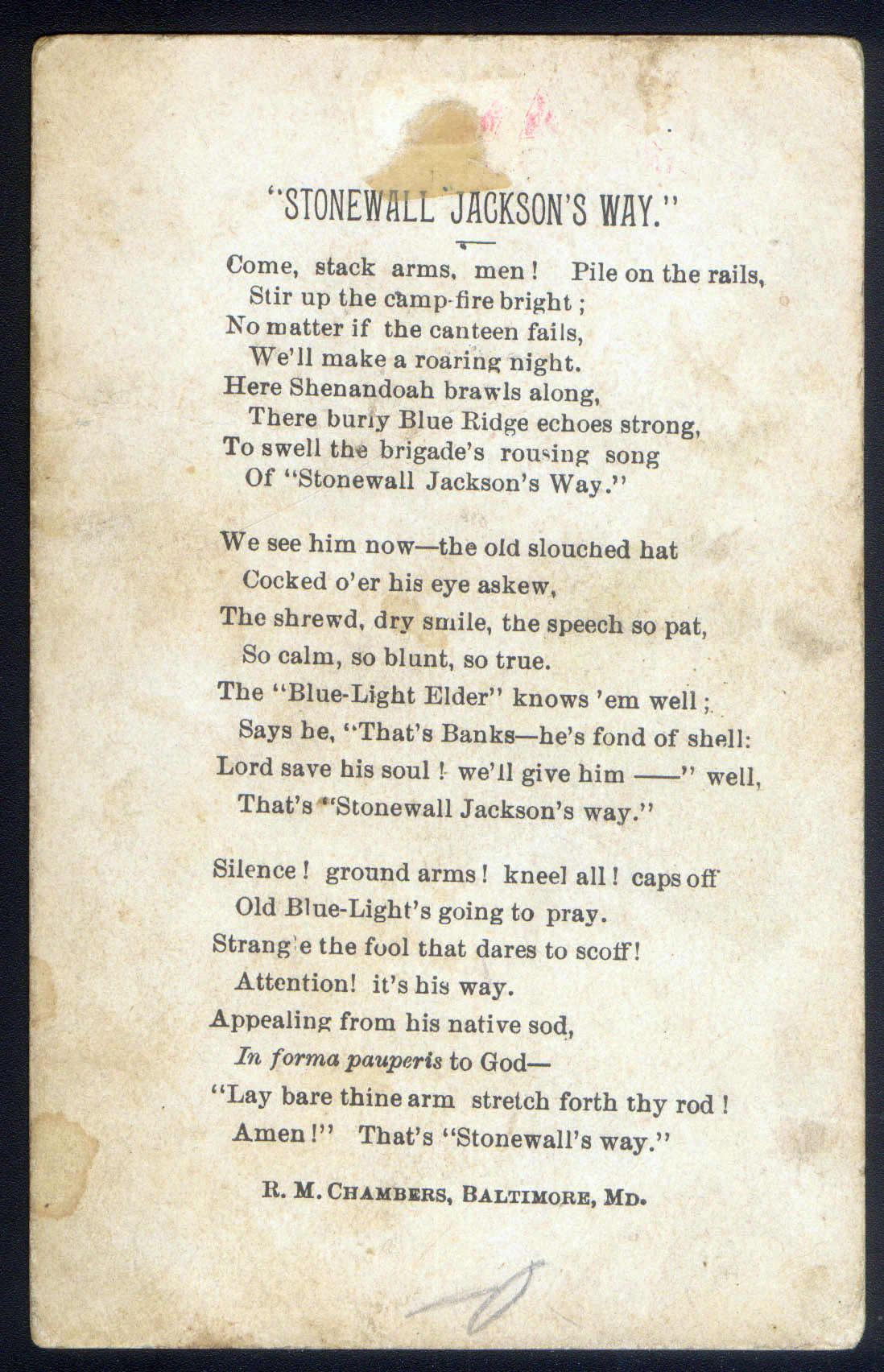 The Bonnie Blue Flag ( By Harry Mccarthy ) and Stonewall Jackson’s Way on Heavy Card Stock by R.M. Chambers, Baltimore, Maryland, Produced During the Civil War. Multicolor Flags With Several Stains & Spots on Both Sides.