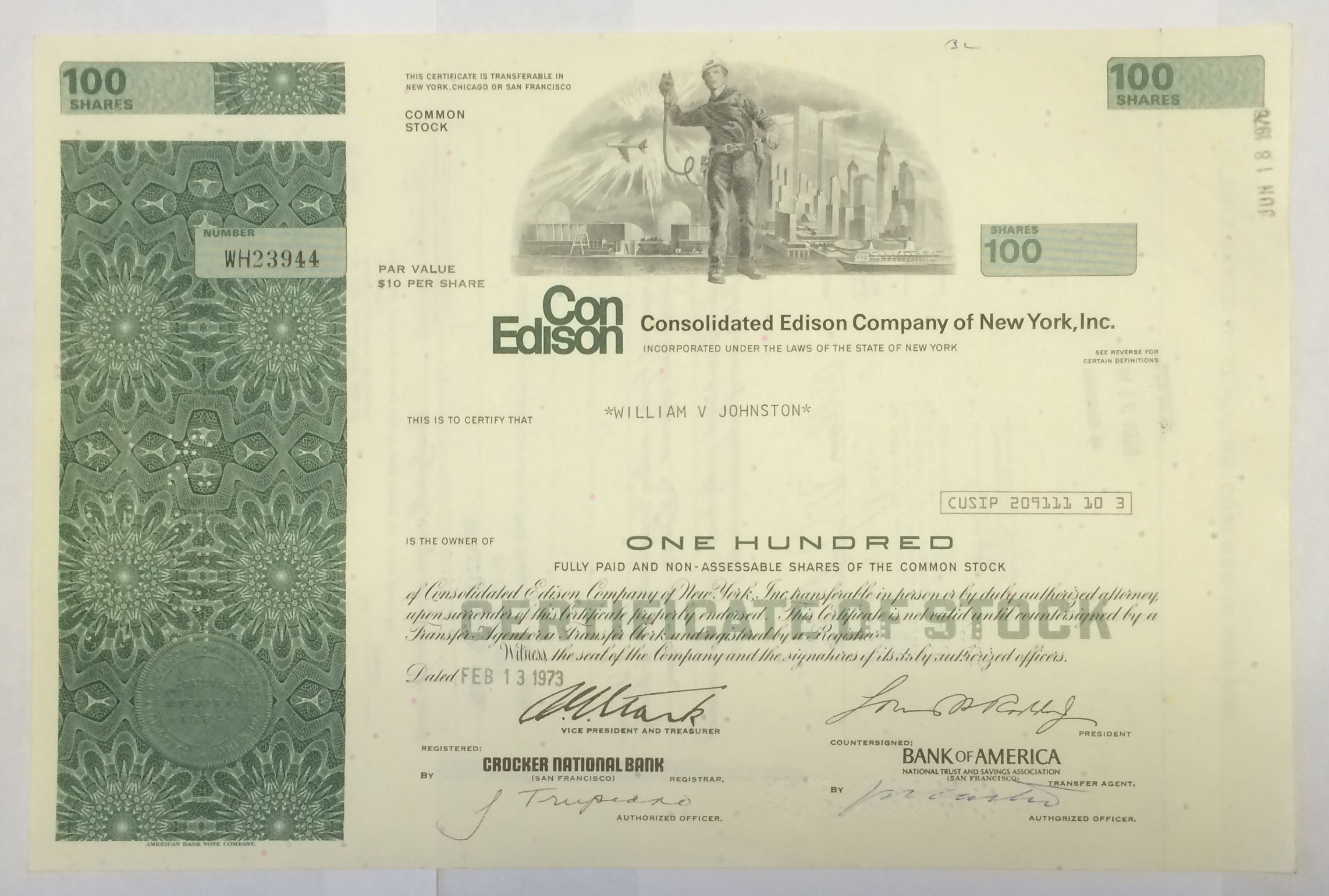 CON EDISON STOCK CERTIFICATE with NEW YORK CITY SKYLINE; Featuring a Con Ed worker in front of a view of downtown Manhattan, the World Trade Center & flying jet.