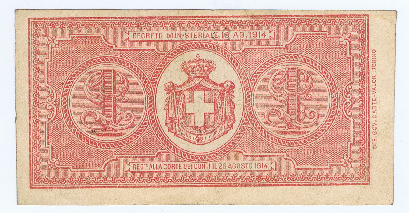 ITALY LOWEST DENOMINATION (1 LIRE) BANKNOTE of WWI MISCUT (BOTH SIDES)