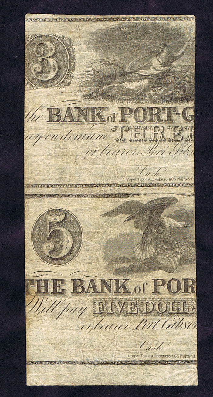 PRINTED on the REVERSE of a BANK of PORT GIBSON (MISSISSIPPI) $3 & $5 NOTES
