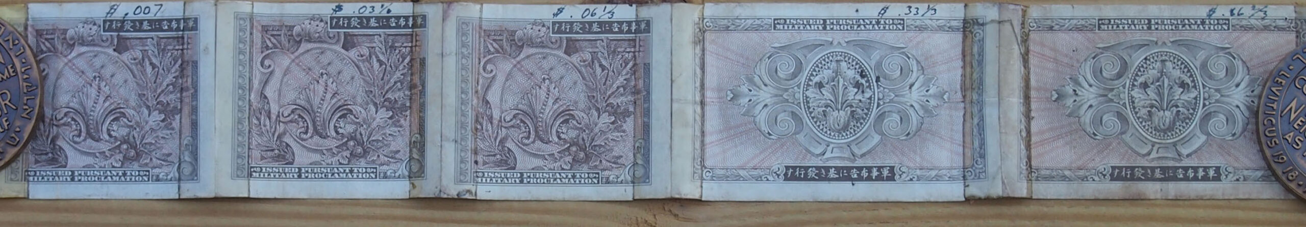 POST WWII – SHORT SNORTER BELT of 5 with JAPANESE ALLIED MILITARY CURRENCY ONLY ( as part of or formerly part of a larger belt ? ) APPROXIMATELY 20 INCHES LONG