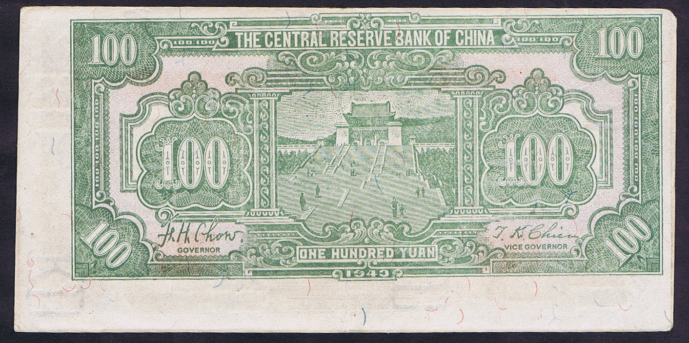 THE CENTRAL RESERVE BANK of CHINA 100 YUAN of 1943 MIS-REGISTERED ERROR on the REVERSE