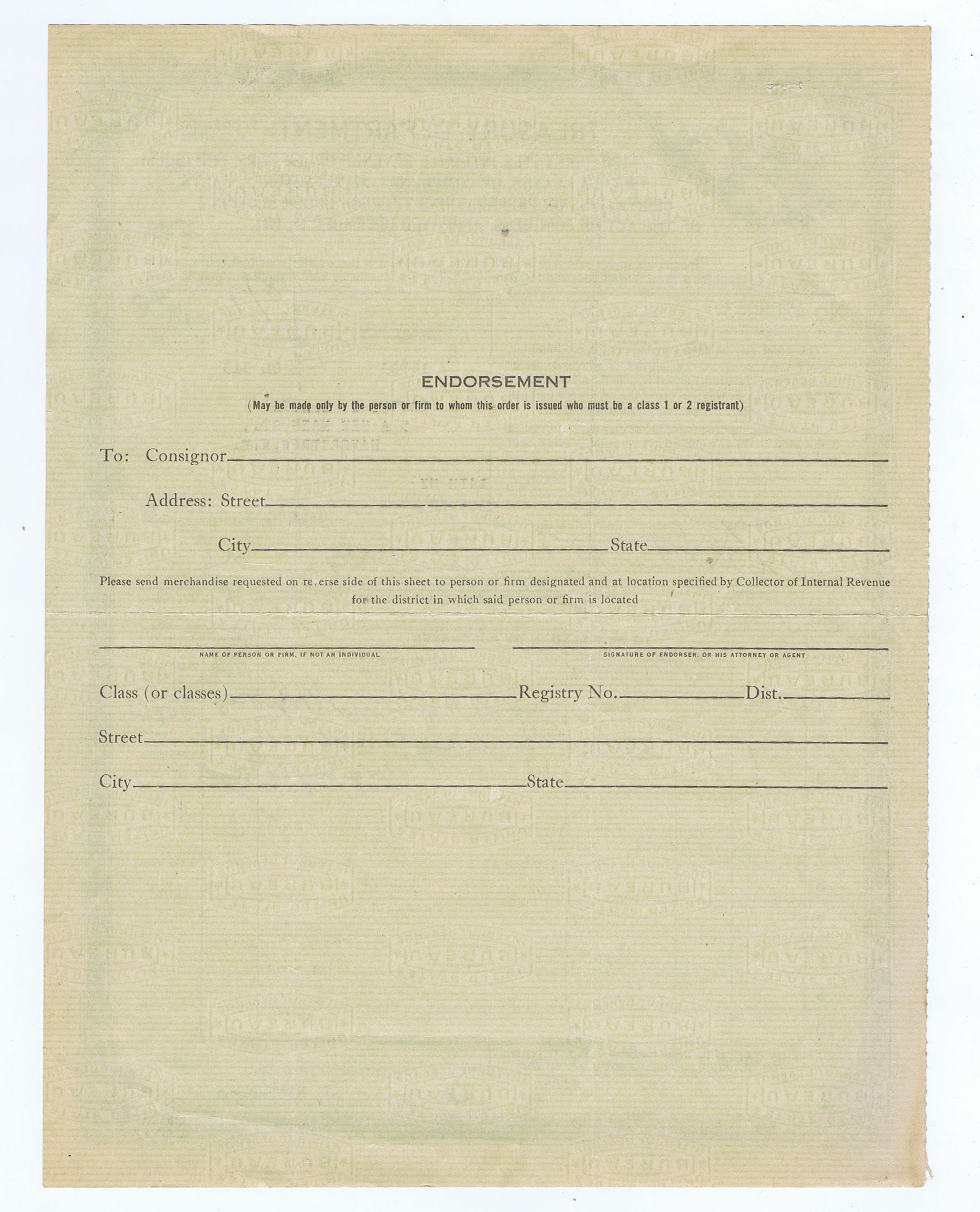 TREASURY DEPARTMENT – UNITED STATES INTERNAL REVENUE ORDER FORM for OPIUM or COCA LEAVES or………. ORIGINAL (not DUPLICATE) of 1943 PICTURED with POPPY PLANTS in the UPPER LEFT CORNER. REGISTRY DUMONT, NJ. to KALTMAN & CO of JERSEY CITY.
