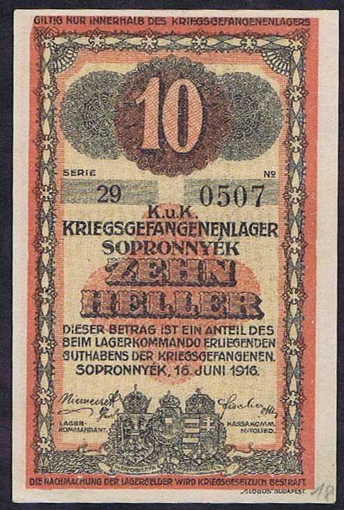 WORLD WAR I HUNGARIAN PRISONER of WAR CAMP ‘SOPRONYEK’ for RUSSIAN and ROMANIAN OFFICERS – 10 FILLER NOTE